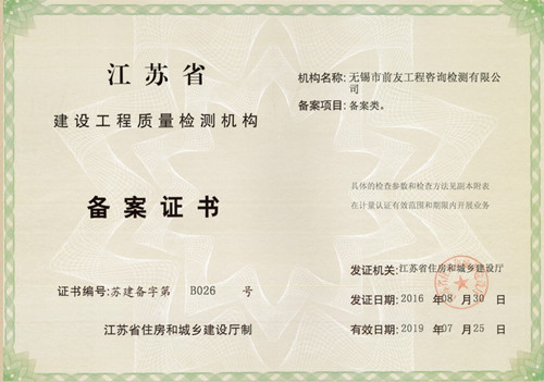 近日,無錫市前友工程咨詢檢測有限公司從江蘇省住房和城鄉建設廳行政服務中心領回了嶄新的《建設工程質量檢測機構資質證書》和《江蘇省建設工程質量檢測機構備案證書》。據此,公司資質延續工作已率先順利完成。 自2006年成立以來,公司在各級主管部門的領導和關心下,在廣大客戶的支持和配合下,在全體職工的不懈努力下,檢測能力逐步提高,至今,已具備了以下檢測資質能力項目: 見證取樣類:水泥物理力學性能;鋼筋(焊接連接)力學性能;砂、石常規;混凝土、砂漿強度;簡易土工;混凝土摻加劑(外加劑、粉煤灰);瀝青、瀝青混合料;預應力鋼絞線、錨夾具、金屬螺紋管。 專項檢測類:主體結構工程現場檢測(包括鋼筋保護層、現場強度檢測、結構性能、后置埋件力學檢測);鋼結構工程檢測(包括鋼結構工程用鋼材、連接件、鋼結構焊縫質量、防腐防火涂層、鋼結構變形);建筑節能檢測(建筑節能材料檢測、建筑節能現場檢測和熱工性能現場檢測)。 備案檢測類:室內環境檢測、建筑水電檢測、墻體、屋面材料、飾面材料、防水材料、門窗檢測。 安全檢測類:鋼管、扣件、承插型盤扣式鋼管支架檢測。 測繪類:工程測量、不動產測繪。 其它類:相零線檢測、 截面尺寸檢測(現澆樓板厚度檢測)、室內空間尺寸檢測、輕鋼龍骨、石膏板、鋁塑復合板檢測。