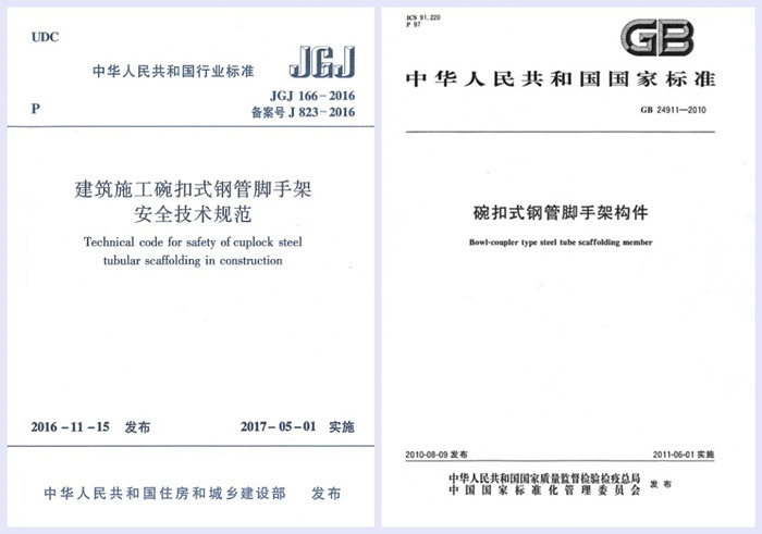 行業標準《建筑施工碗扣式鋼管腳手架安全技術規范》(JGJ 166-2016)已經國家住建部批準,自2017年5月1日起實施,原JGJ166-2008同時廢止。 該規范的主要技術內容有:1.總則;2.術語和符號;3.構配件;4.荷載;5.結構設計;6.構造要求;7.施工;8.檢查與驗收;9.安全管理。 該規范修訂的主要技術內容有:(1)立桿鋼管材質增加了Q345級鋼的規定,上碗扣和水平桿接頭增加了采用鍛造工藝成型時的材質規定,并增加了立桿碗扣節點間距采用0.5m模數的規定;(2) 調整了永久荷載、施工荷載、風荷載的標準值;(3)增加了荷載分項系數表,對荷載組合表進行了調整;(4) 增加了半剛性碗扣節點的轉動剛度取值規定;(5)增加了水平桿抗彎強度及撓曲變形驗算式;(6)修改了風荷載作用引起的模板支撐架立桿附加軸力的計算式;(7)給出了模板支撐架在風荷載作用下的簡化水平力和傾覆力矩的計算式;(8)增加了雙排腳手架連墻件的強度和穩定性計算式;(9)修改了雙排腳手架和模板支撐架立桿計算長度的取值規定;(10)修改了雙排腳手架和模板支撐架的斜撐桿和剪刀撐構造要求;(11)修改了雙排腳手架的允許搭設高度表;(12)增加了腳手架施工和安全管理的有關規定;(13)增加了腳手架施工檢查表和驗收記錄表。 其對應的產品國家標準《碗扣式鋼管腳手架構件》(GB 24911-2010)列出了檢測試驗項目:(1)外觀質量;(2)尺寸;(3)上碗扣強度;(4)下碗扣焊接強度;(5)橫桿接頭強度;(6)橫桿接頭焊接強度;(7)可調支座抗壓強度。
