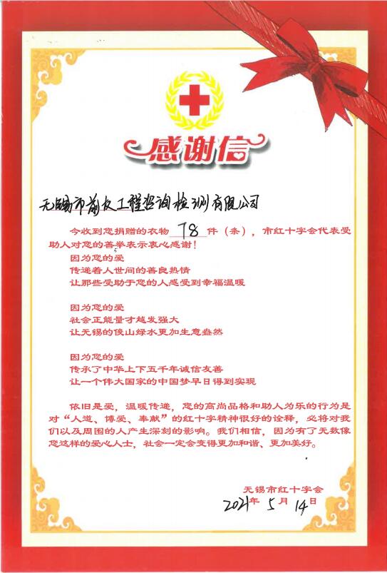 2021年是我們偉大的中國(guó)共產(chǎn)黨建黨100周年,在慶祝黨百年華誕的重大時(shí)刻,在“兩個(gè)一百年”奮斗目標(biāo)歷史交匯的關(guān)鍵節(jié)點(diǎn),無(wú)錫市前友工程咨詢(xún)檢測(cè)有限公司再次組織愛(ài)心衣物捐贈(zèng)活動(dòng),以實(shí)際行動(dòng)獻(xiàn)禮建黨100周年。 此次衣物捐贈(zèng)受益對(duì)象為本市低收入家庭、殘疾人家庭、外來(lái)務(wù)工人員、遭遇突發(fā)事件陷入困境的家庭、對(duì)外援助貧困和受災(zāi)地區(qū),因此,本次活動(dòng)得到了公司員工的積極響應(yīng)和大力支持。廣大員工積極踴躍參加,整理家中閑置衣物。此次共收到員工捐贈(zèng)的衣物90余件,從中選擇出符合捐贈(zèng)要求的衣物78件,整理打包后已于5月14日送至市紅十字會(huì)統(tǒng)一捐贈(zèng)。前友的發(fā)展得益于改革開(kāi)放的偉大時(shí)代,前友人有一顆感恩的心。 本次愛(ài)心衣物捐贈(zèng)活動(dòng),激發(fā)了公司員工參與公益事業(yè)、傳遞愛(ài)心的熱情,折射出了前友人身上所具有的助人為樂(lè)、無(wú)私奉獻(xiàn)的良好品格,彰顯了公司的社會(huì)責(zé)任感。讓我們繼續(xù)為愛(ài)助力,為實(shí)現(xiàn)中華民族兩個(gè)一百年的宏偉目標(biāo)努力工作,付出自己的微薄之力。