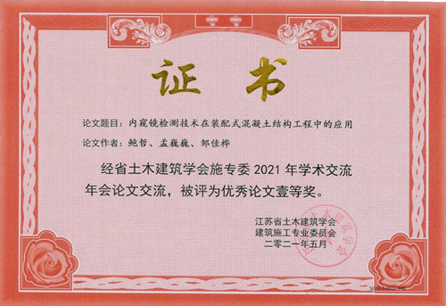江蘇省土木建筑學會建筑施工專業委員會第十屆三次會議暨2021年學術交流會于2021年5月26日至28日在揚州市召開。 會議總結交流了各市學會工作,研究并完善2021年省建筑施工專業委員會工作計劃;會議組織了學術交流,主題為“科技引領建造、創新江蘇施工技術”;評審了2020年度江蘇省優秀施工學術論文,從全省各市推薦參加交流的300篇論文中,評出一等獎33篇,二等獎62篇,三等獎85篇;評選了2020年度省土木建筑學會建筑施工技術(學術)先進個人12人、先進集體6個。 無錫市前友工程咨詢檢測有限公司,為國家高新技術企業,持續學習創新。這次,由鮑哲等撰寫的“內窺鏡檢測技術在裝配式混凝土結構工程的應用”榮獲一等獎。
