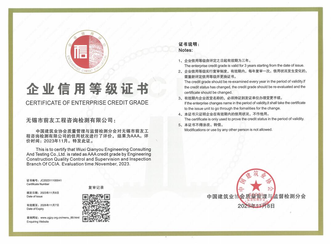 近日,公司收到了中國建筑業協會頒發的“關于公布建筑業AAA級信用企業(檢測機構)的通知”,公司再次榮獲全國建筑業AAA級信用企業證書。 為深入落實國家信用體系建設要求,推進建設工程檢測市場信用體系建設,促進企業誠信經營,中國建筑業協會質量管理與監督檢測分會組織開展了2023年度建筑業AAA級信用企業(檢測機構)評價工作。本著公開、公平、公正的原則,經檢測機構自愿申請、省級推薦單位推薦、信用信息核實、專家組綜合評價及網上公示,確定北京市建設工程質量第一檢測所有限責任公司等142家檢測機構為2023年度建筑業AAA 級信用企業(檢測機構),現已發文公布。 誠信企業的建設永遠在路上。無錫市前友工程咨詢檢測有限公司將以此作為加快公司高質量發展的新動力,進一步加強信用體系建設,練實內功,優化服務,積極履行社會責任,為促進行業持續健康發展做出新的貢獻。