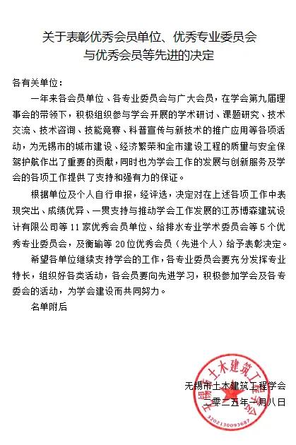 最后張鵬飛副主席對(duì)土木學(xué)會(huì)2024年獲得無(wú)錫市科協(xié)年度綜合評(píng)選“五星”級(jí)學(xué)會(huì)、獲得首批一流學(xué)會(huì)表示祝賀。張主席強(qiáng)調(diào),學(xué)會(huì)需進(jìn)一步強(qiáng)化創(chuàng)新引領(lǐng),深化與高校產(chǎn)學(xué)研合作;不斷提升服務(wù)能力和水平,優(yōu)化技術(shù)咨詢(xún)與服務(wù)對(duì)接;同時(shí),加強(qiáng)學(xué)會(huì)自身建設(shè)與管理,優(yōu)化會(huì)員結(jié)構(gòu),共促行業(yè)蓬勃發(fā)展。