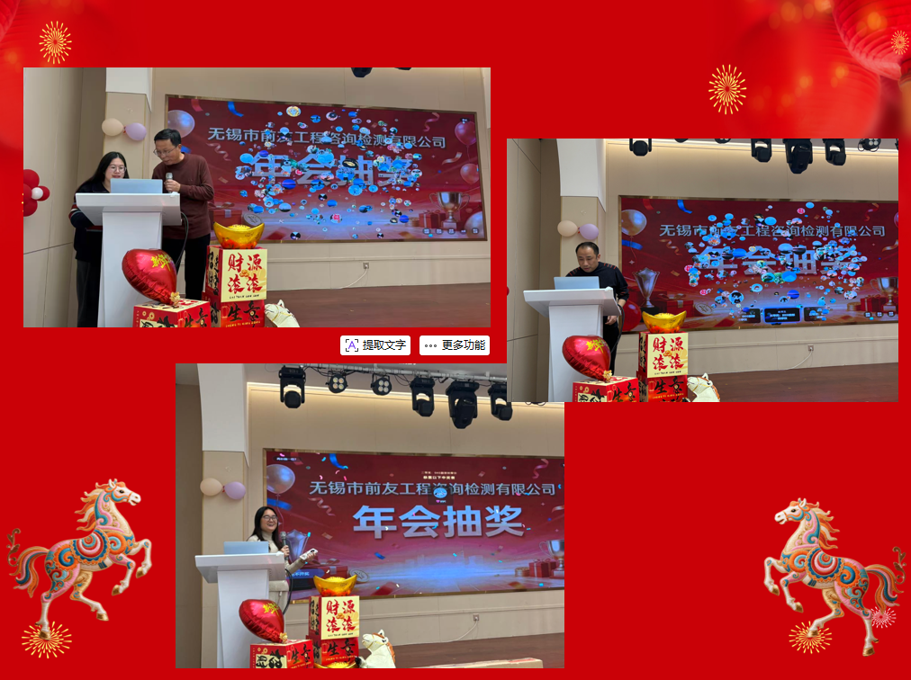 金蛇銜福辭舊歲,駿馬奔騰賀新春。2月12日,馬年新春佳節即將來臨之際,無錫市前友工程咨詢檢測有限公司全體員工伴隨著歡快的樂曲歡聚一堂,共憶過往耕耘,共話未來愿景,共度一段溫馨而熱烈的美好時光。 年會上,公司總經理鄒佳樺發表了新春致辭,向全體員工送上新春的美好祝福與誠摯感謝。2025年,憑借全體員工的持續努力,公司榮獲了江蘇省專精特新中小企業、無錫市模架協會優秀企業、江蘇省建設工程質量檢測技術創新論文一等獎以及無錫碩放機場改擴建工程2025年度勞動競賽先進單位等榮譽,充分展現了公司的市場競爭力與企業形象。 致辭結束后,年會進入最令人期待的抽獎環節,現場氛圍瞬間被推向高潮。伴隨一次次開獎,現場掌聲與歡呼聲此起彼伏,每份獎品都飽含公司對員工的關懷之情,也寄托著對新一年的美好祝愿。員工們陸續登臺獻唱,以歌聲和笑聲傳達馬年的快樂與祝福,彰顯前友員工積極向上的精神面貌。現場氣氛異常熱烈,鄒總臨時決定增設一個一等獎的抽獎名額,這一突如其來的好消息瞬間引爆全場。公司多年積淀的企業文化,已將前友員工緊密相連,匯聚成一個生機勃勃、溫情滿滿的幸福大家庭,杯盞交錯間,暖流涌動,歡樂的氛圍持續整場晚會。 伴著歡聲笑語慢慢消散,2025年也完美畫上句點。舊歲已展千重錦,新年再進百尺竿。2026馬年新征程已然開啟,前友人將懷揣更加熾熱的激情,秉持更加堅定的信念,策馬揚鞭、奮勇爭先,昂首闊步踏上新的奮斗征程,共同書寫公司高質量發展的新篇章!